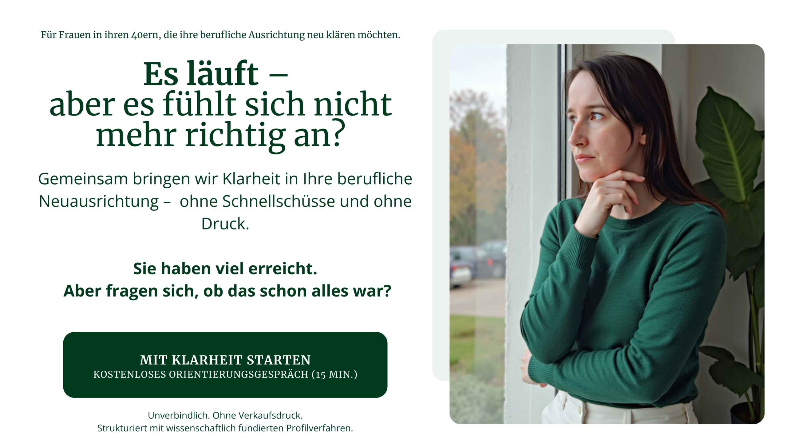 Ich arbeite nicht nur mit Bewerbungsstrategien, sondern mit Persönlichkeit, Werten und Entscheidungsstruktur. Es geht nicht um „höher, schneller, weiter“, sondern um Passung und innere Stabilität.